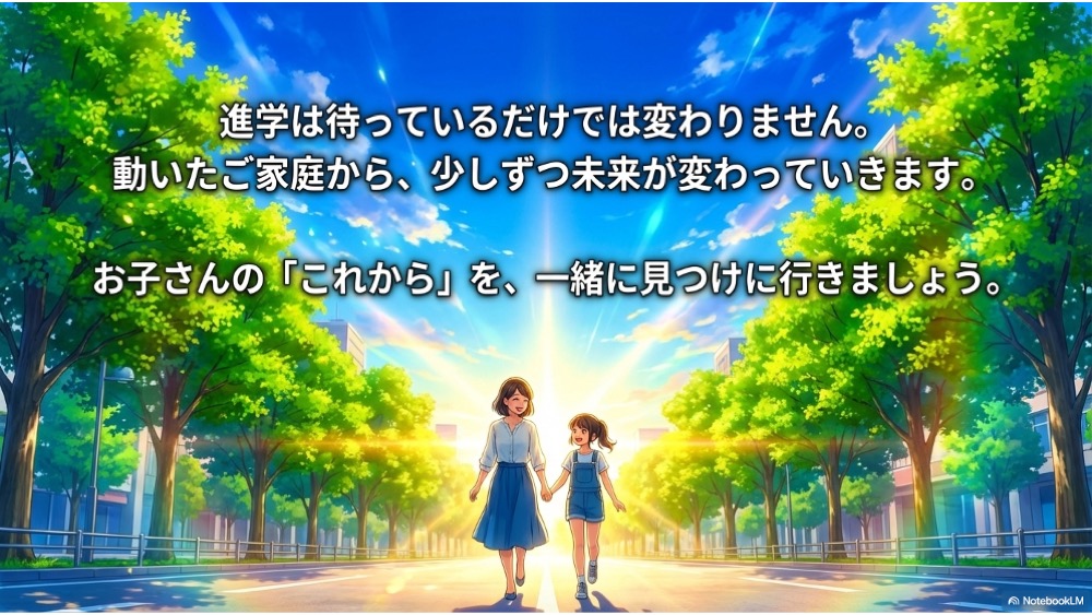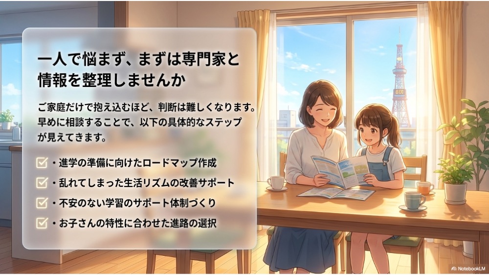 A. 不登校の悩みをご家庭だけで抱え込むと、判断が難しくなりやすいためです。早めに相談することで、進学の準備、生活リズムの改善、学習のサポート、進路の選択など、具体的な方向性が見えてきます。少し早く動くことで、選べる未来が広がることがあります。