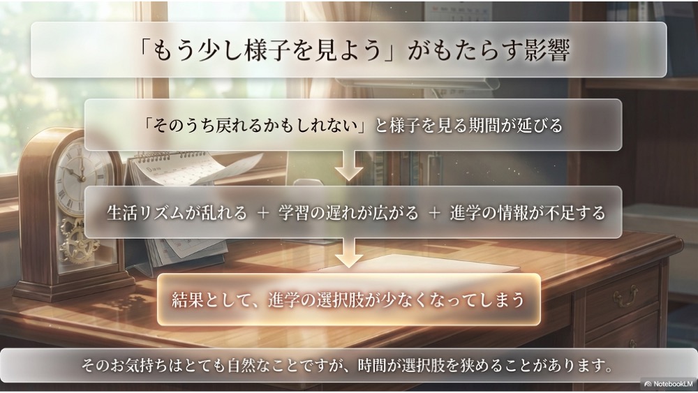 A. はい、影響が出ることがあります。様子を見る期間が長くなるほど、生活リズムの乱れ、学習の遅れ、進学情報の不足といった課題が生じやすくなります。その結果、進学の選択肢が少なくなってしまうケースもあるため、早めの情報収集と相談が大切です。