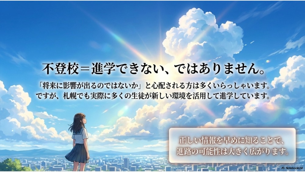 A. はい、不登校であっても札幌で高校進学は十分に可能です。実際に、フリースクール、通信制高校、サポート校などを活用しながら進学している生徒は多くいます。不登校だから進学できない、ということではありません。