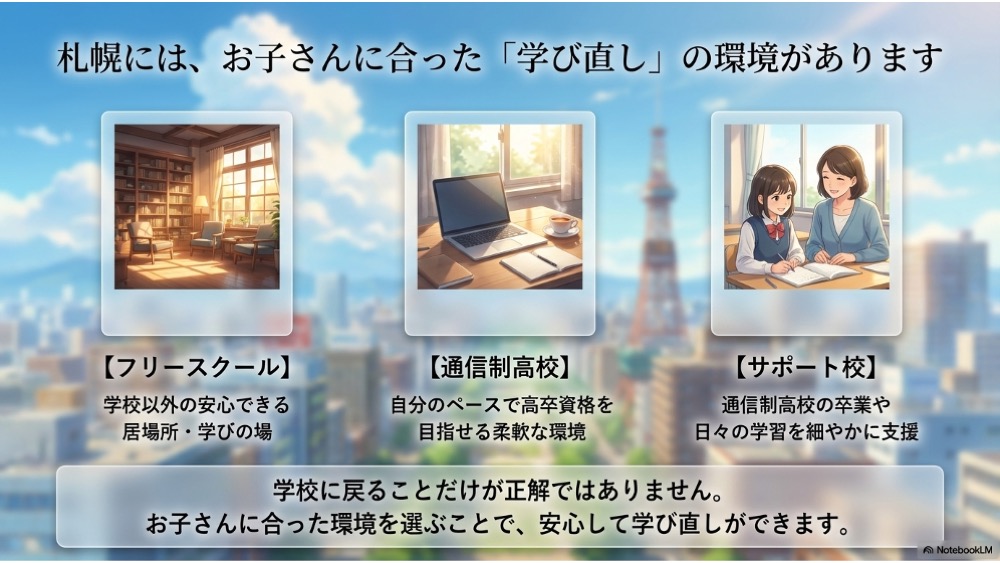 A. 札幌には、フリースクール、通信制高校、教育支援施設など、さまざまな選択肢があります。学校に戻ることだけが正解ではありません。お子さんに合った環境を選ぶことで、安心して学び直しや進路準備を進めることができます。