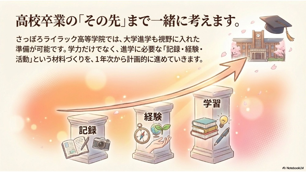 さっぽろライラック高等学院では、高校卒業だけでなく大学進学も一緒に目指すことを大切にしています。