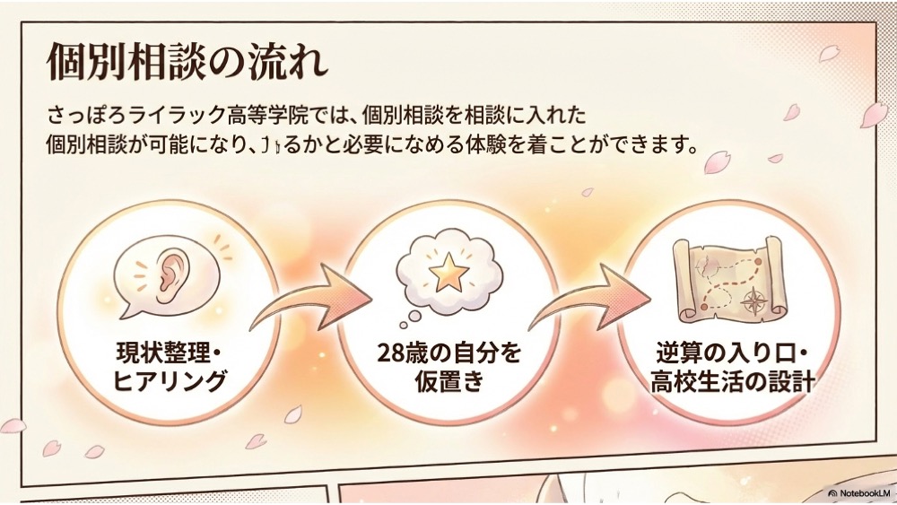 さっぽろライラック高等学院の入学前個別相談では、高校進学から高校生活、その先の大学進学までを見据えて、今の状態に合った「次の一手」を一緒に整理します。