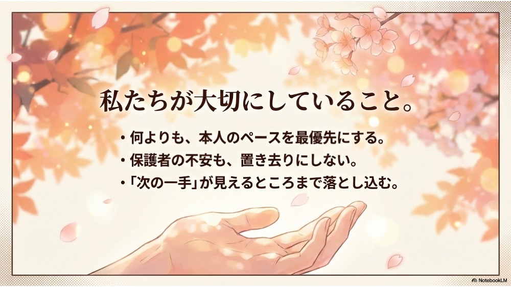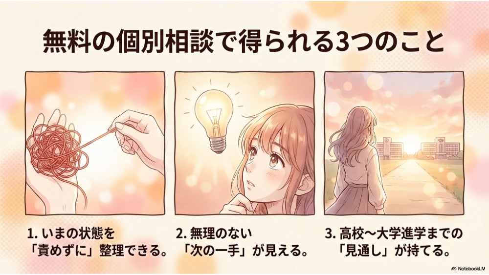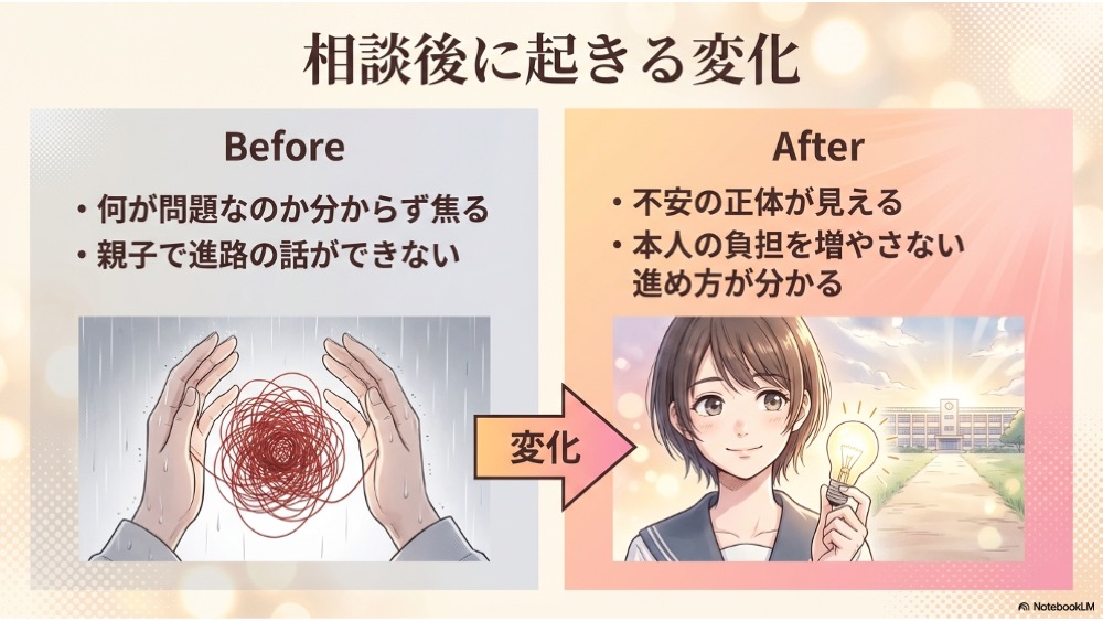 大きな決断を迫りません。今の状態に合った、無理のない一歩を具体化します。「何から?」が分かると、親子の空気も変わります。