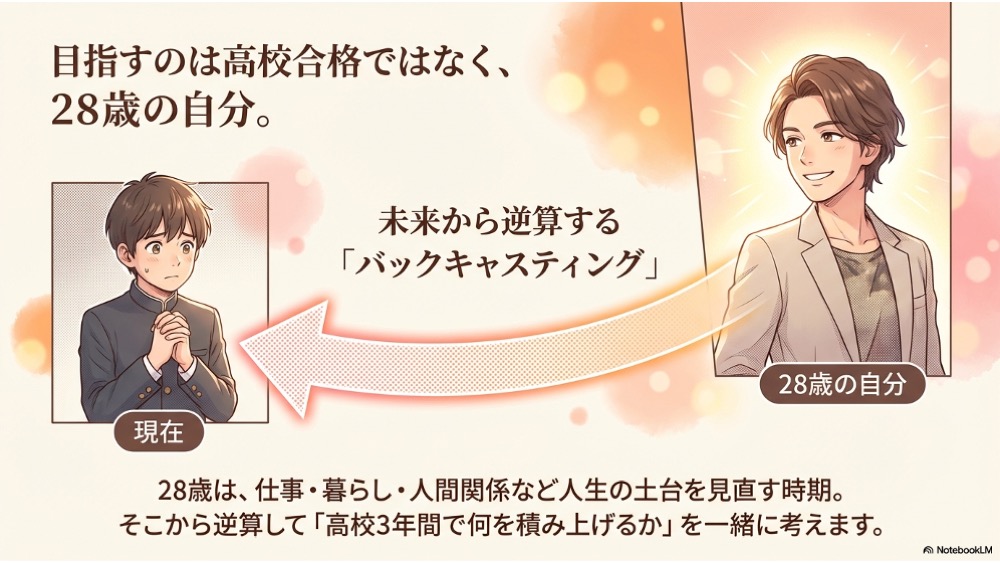 “28歳の自分が、納得して働き、生きている未来”を仮置きし、そこから逆算して「高校3年間で何を整え、何を積み上げるか」を一緒に考えます。