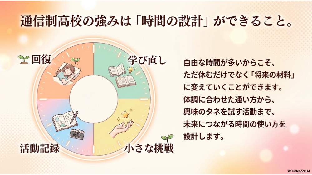 通信制高校は自由に使える時間が多いからこそ、回復・学び直し・小さな挑戦・記録(進路の材料)に変えていくことで、将来の選択肢を増やせます。