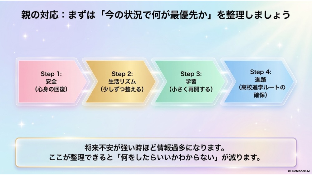 将来不安が強い時ほど、親は情報過多になります。優先順位はシンプルです。
