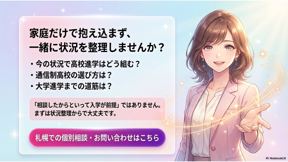 札幌で、不登校から大学進学まで見据えて進路を一緒に整理したい場合は、個別相談を活用してください。