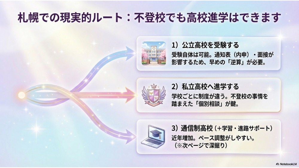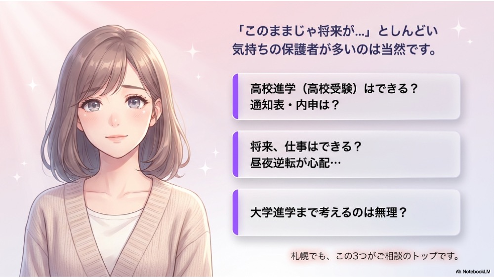 「高校進学できるか」が将来不安の中心です。札幌(北海道)でも選択肢は複数あります。