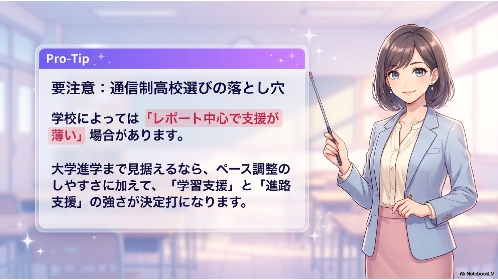 学校によります。レポート中心で支援が薄い場合もあるため、学習支援・進路支援の中身を確認しましょう。