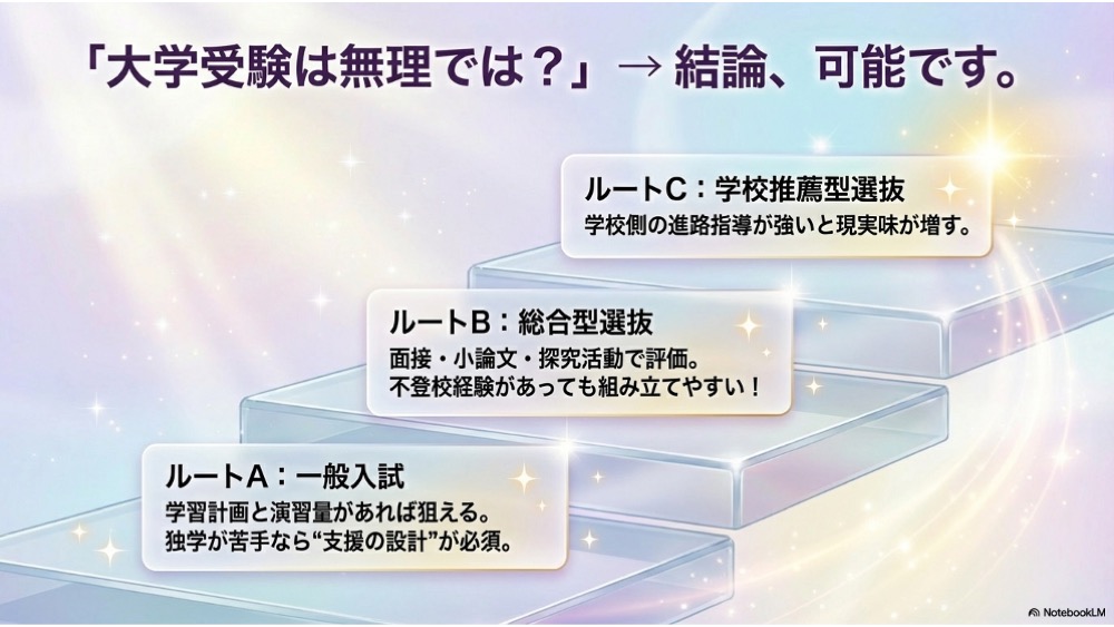 「大学受験は無理では?」という不安はよくあります。結論、可能です。