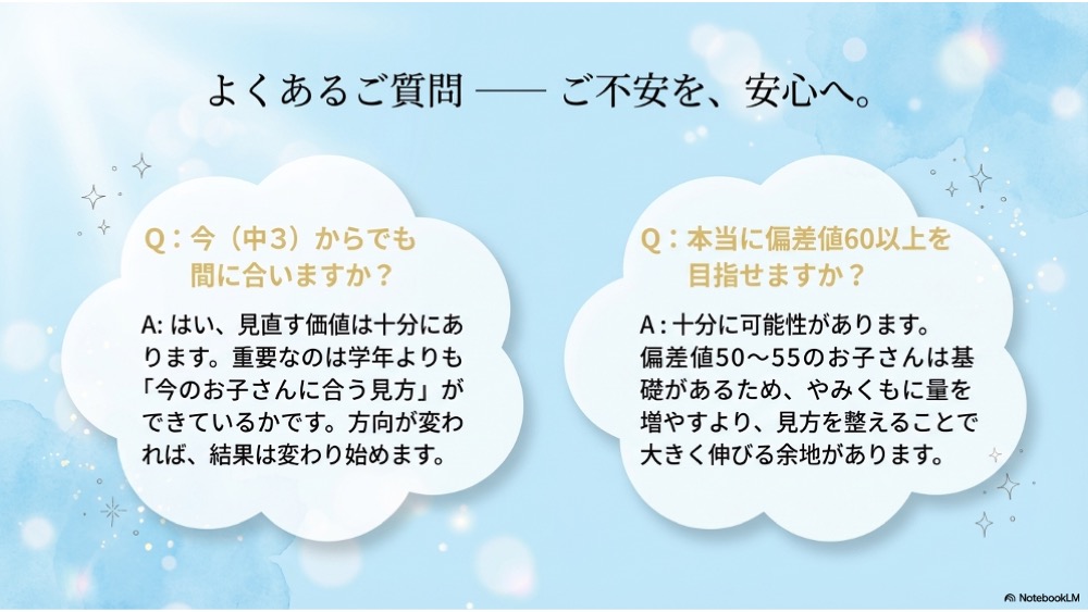 偏差値50〜55のお子さんは、基礎がまったくないわけではなく、まだ整理が足りない状態 であることが少なくありません。