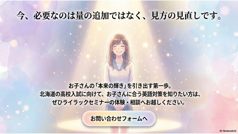 そうなる前に必要なのは、量の追加だけではなく、北海道の高校入試に向けた英語対策の方向そのものを見直すこと です。