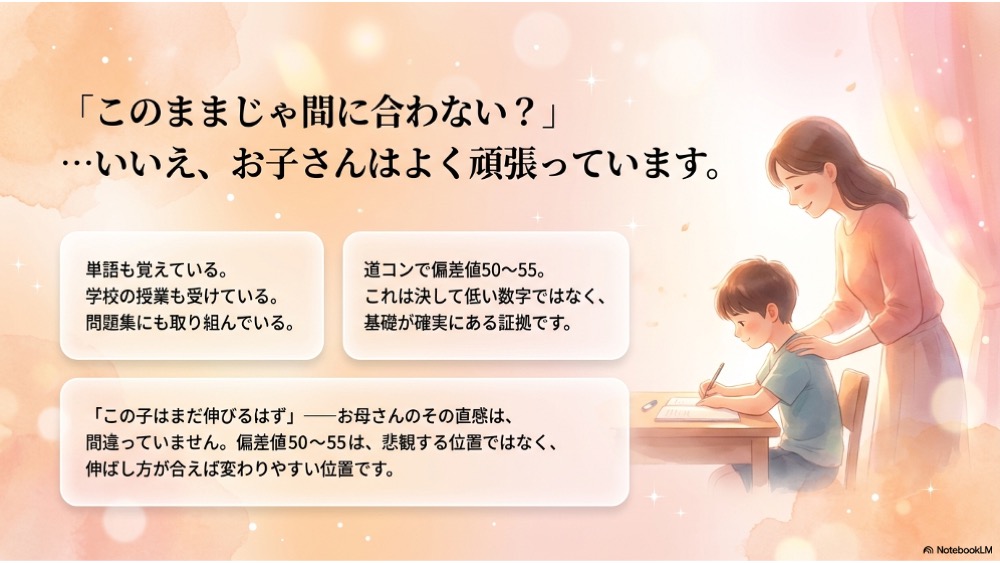 その感覚は、とても大事です。偏差値50〜55は、悲観しすぎる位置ではありません。むしろ、伸ばし方が合えば変わりやすい位置 です。