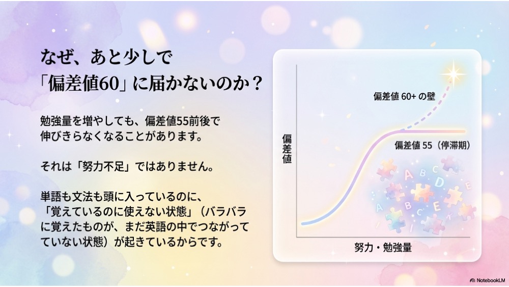 特に、道コンで英語偏差値50〜55くらいから、60以上を目指したい と考えているご家庭にとって、このテーマはとても切実だと思います。