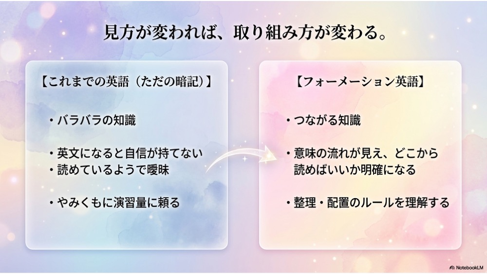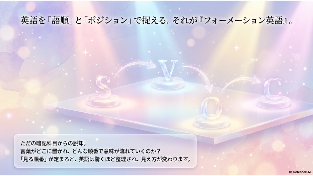 フォーメーション英語は、「もっと覚える」より先に、どう見れば英語がわかりやすくなるか を整えていく発想です。