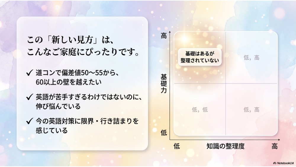 道コンで英語偏差値60以上を目指したい方、英語が苦手すぎるわけではないのに伸び悩んでいる方、単語や文法はやっているのに英文になると自信が持てない方、今の英語対策に限界を感じているご家庭に向いています。