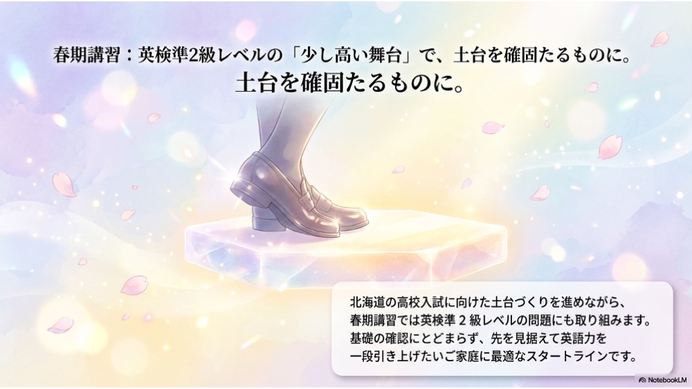 春期講習では英検準2級レベルの問題にも取り組みながら、北海道の高校入試に向けた英語の土台づくりを進めていきます。