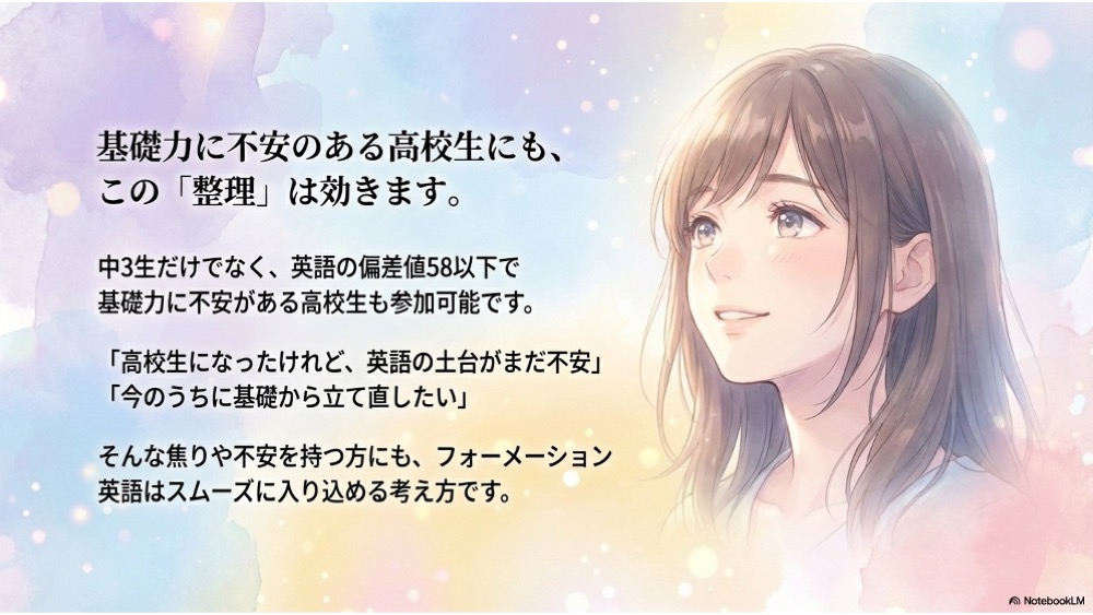 また、中3だけでなく、英語偏差値58以下で基礎力に不安がある高校生も参加できます。
