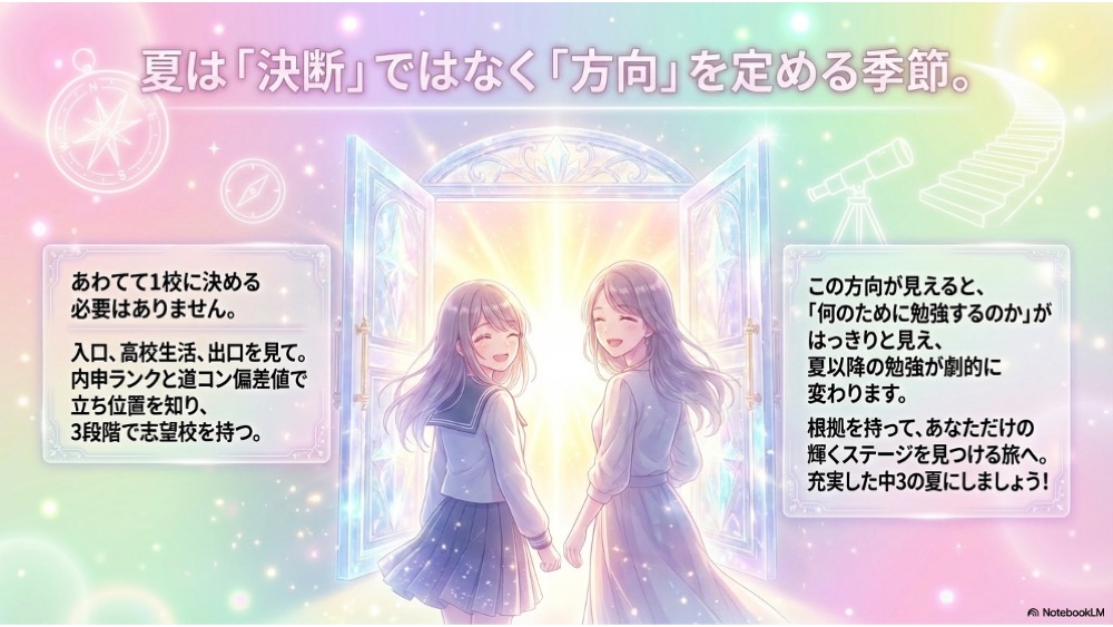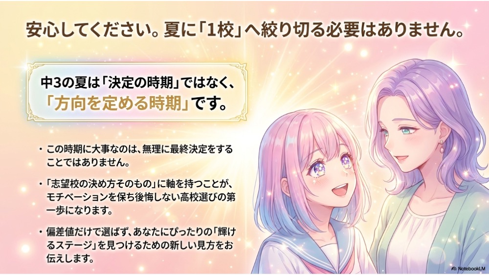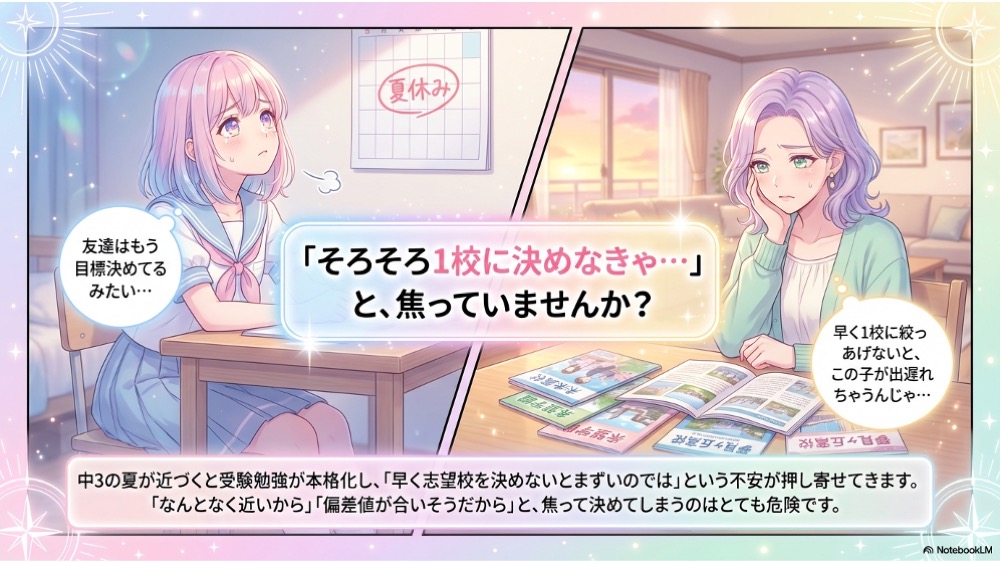 中3の夏までに必要なのは、あわてて1校に決めることではありません。