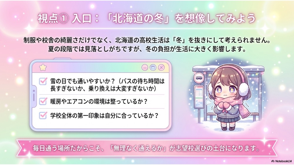 北海道の高校選びでは、冬の環境も確認したほうがいいですか?