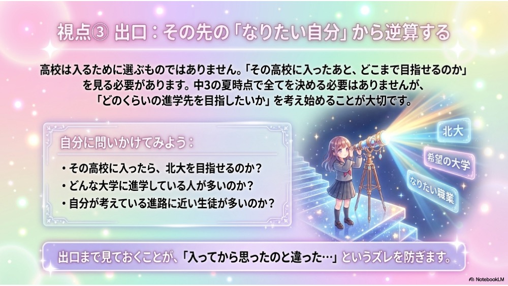 出口まで見ておくことが、後悔しにくい志望校の決め方につながります。