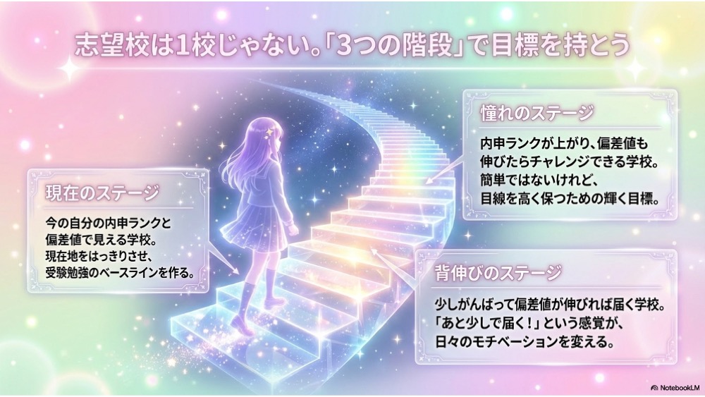 志望校は1校だけで考えるのではなく、3段階で考えるのがおすすめです。具体的には、今の自分の内申ランクと偏差値で見える学校少しがんばって偏差値が伸びれば届く学校内申ランクが上がって、偏差値も伸びたらチャレンジできる学校の3つです。こうして考えることで、今の立ち位置と、これからどこを目指すかが整理しやすくなります。