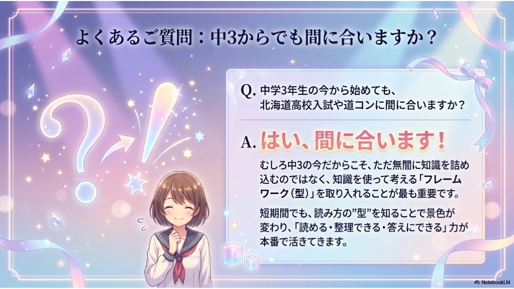 A. はい、中学3年生の今だからこそ、知識を増やすだけでなく、知識を使って考えるためのフレームワークを入れることが重要です。三色読解は、北海道の入試で求められる「読めるか」「整理できるか」「答えにできるか」という力を、再現できる形で身につけることを目指します。まずは無料個別相談でお子様の現状を整理し、今優先すべきことを見つけましょう。