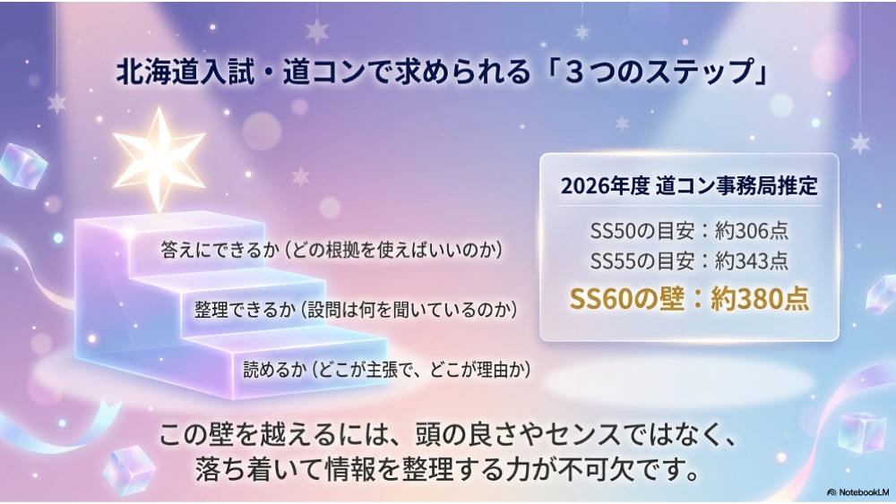 なお、道コンSSは入試当日点の目安としても使われ、2026年度の事務局推定ではSS50が約306点、SS55が約343点、SS60が約380点とされています。だからこそ、5教科で「読める・整理できる・答えにできる」力の土台をつくることには意味があります。
