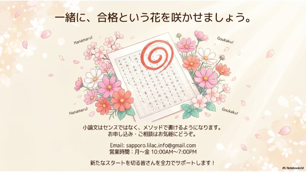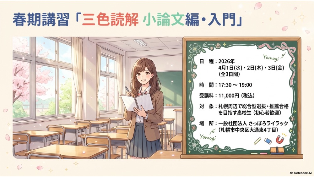 こんにちは。札幌市中央区の一般社団法人さっぽろライラックです。 新学期に向けて、総合型選抜や学校推薦での大学合格を目指し、いよいよ小論文の対策を始めようと考えている札幌の高校生の皆さんへ、春期講習の特別なご案内です。