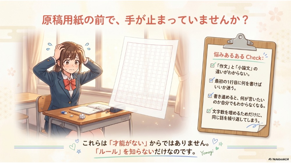 もし一つでも当てはまるなら、ぜひこの先を読んでみてください。「文章を書くセンスがない」と落ち込む必要は全くありません。小論文が書けないのは、あなたの発想力がないからではなく、大学入試で求められる小論文の絶対的な「型(ルール)」を知らないだけなのです。