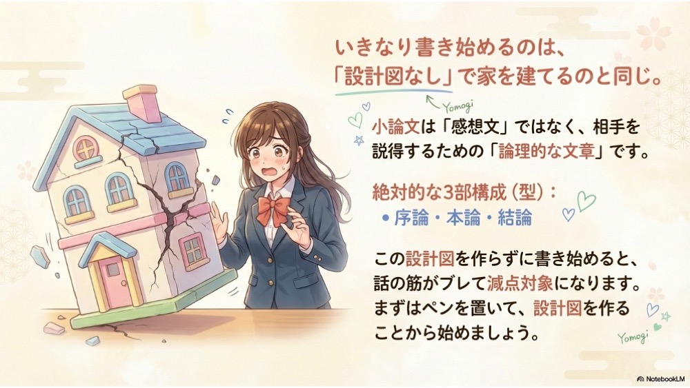 そのため、小論文には「序論(初め)」「本論(中)」「結論(終わり)」という厳格な3部構成(型)が存在します。必ず最初にこの構成を考える必要があり、設計図を作らないまま思いついたことから書き始めると、必ず途中で話の筋がブレたり、ただの感想文になってしまったりして、試験では大きく減点されてしまいます。総合型選抜において、論理性の欠如は命取りになります。