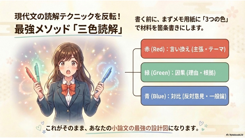 さっぽろライラックが提案するのは、現代文の読むためのテクニックである**「三色読解(言い換え・対比・因果)」の視点を、そっくりそのまま「書くための道具」として反転させる**画期的なメソッドです。