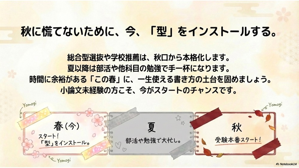 小論文は、一度間違った自己流の書き方(思いつきで書くクセ)が身についてしまうと、後から修正するのが非常に難しい科目です。総合型選抜や学校推薦は、秋口から本格的な試験がスタートします。部活や他の科目の勉強が忙しくなる夏以降に焦って対策を始めるのではなく、時間に余裕がある「この春」に、正しい書き方の「型」をインストールしておくことが、現役合格への最大の武器になります。「小論文なんて今まで一度も書いたことがない」という高校生の皆さんも、ここから一緒にスタートダッシュを切りましょう!