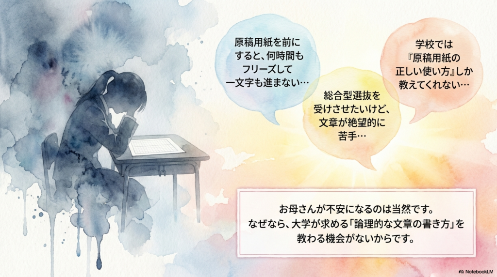 お母さんが「この子に小論文なんて書けるのかしら」と不安になるのは当然です。なぜなら、学校の授業では「原稿用紙の正しい使い方」は教えてくれても、「大学の教授を唸らせる論理的な文章の書き方」までは教えてくれないからです。