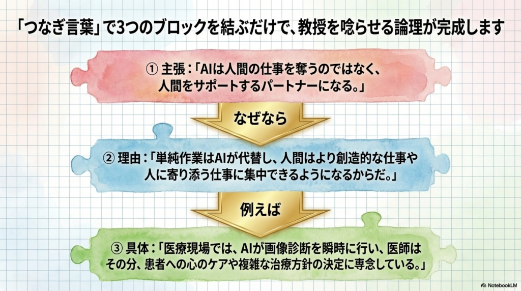 いかがでしょうか。この3つのブロックを「なぜなら」「例えば」「したがって」というつなぎ言葉で結びつけるだけで、あっという間に「大学の教授が求める論理的な小論文」の骨格が完成してしまうのです。