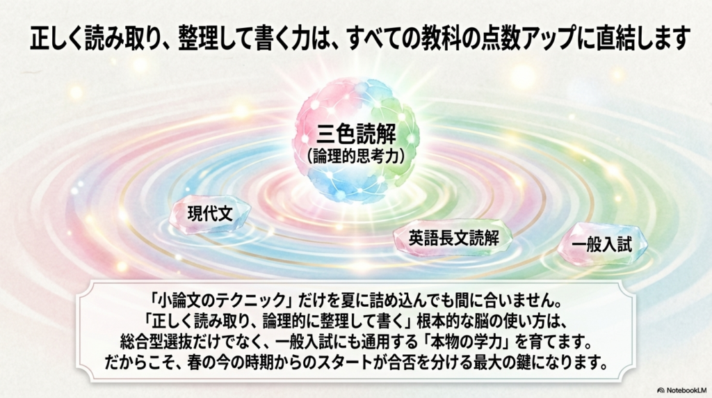 「正しく読み取り、論理的に整理して書く」という根本的な脳の使い方を春から鍛えておくことで、総合型選抜だけでなく、一般入試にも対応できる「本物の学力」が育ちます。夏になってから慌てて「小論文」のテクニックだけを詰め込もうとしても遅いのです。だからこそ、今の時期からのスタートが合否を分ける最大の鍵になります。